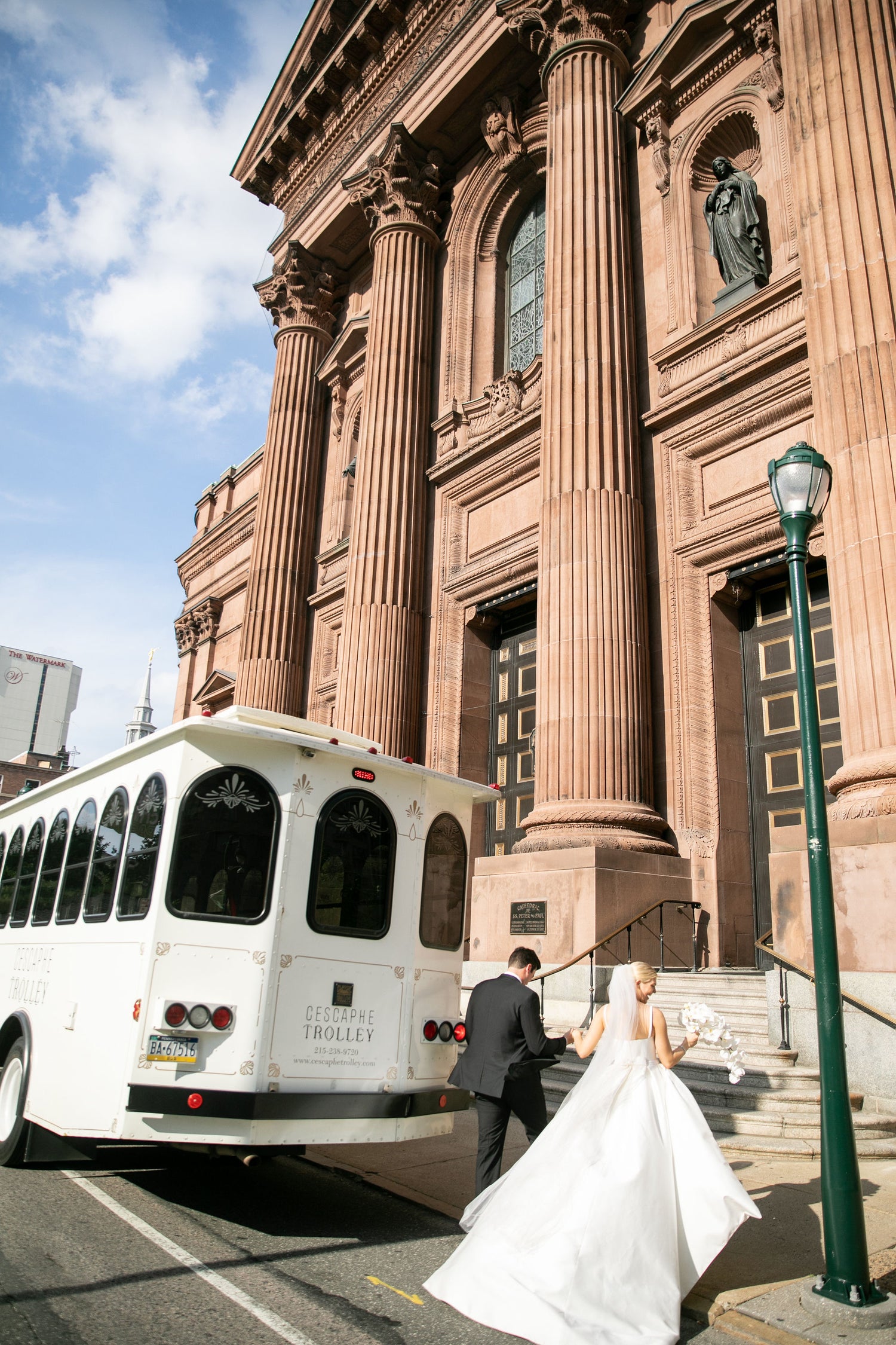 Add an elegant touch to your day with an Old Fashioned Trolley. Cescaphe Trolleys are available in Philadelphia for all of your Transportation needs, specializing in, Weddings and Corporate Events. Our fleet includes 33, 31, and 26 passenger white trolleys, trimmed in gold. The interiors feature classic oak seating with brass handrails.